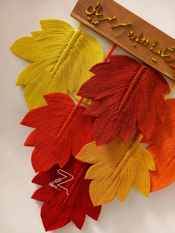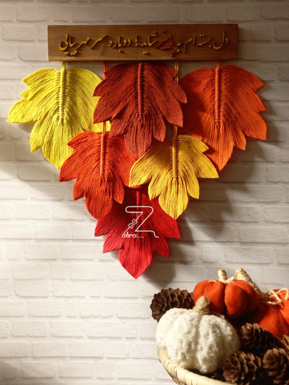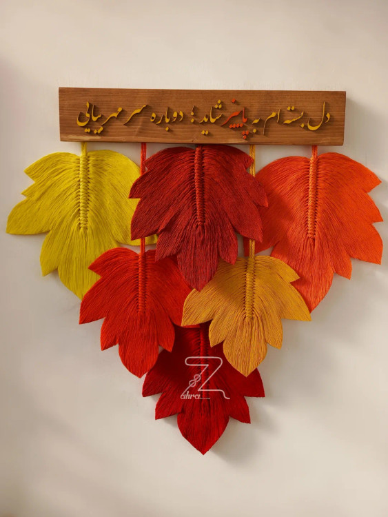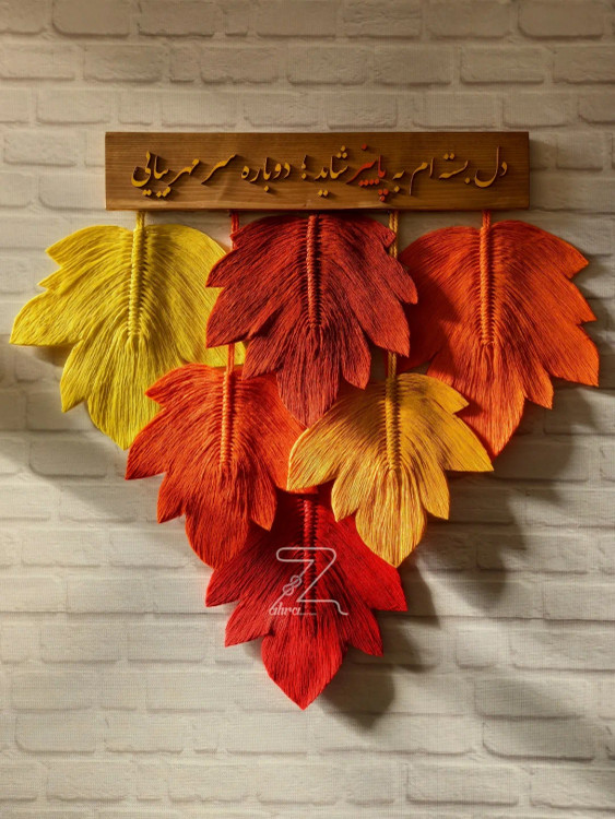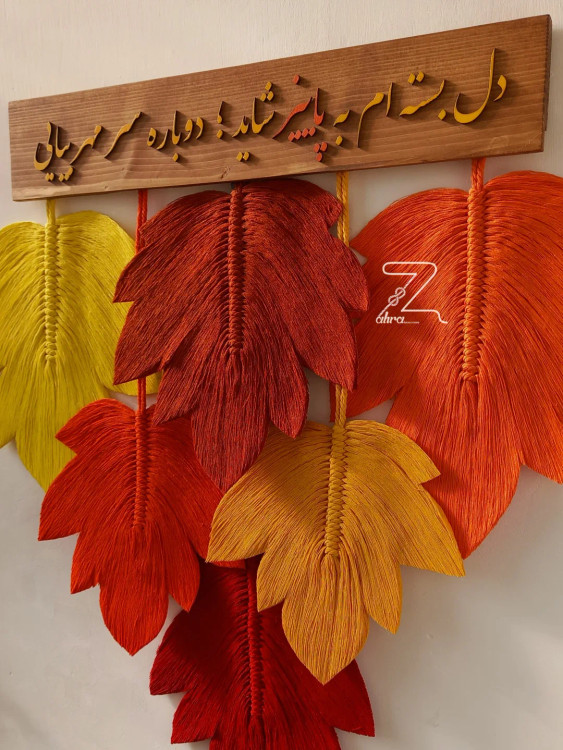 " دل بسته ام به پاییز شاید ؛ دوباره سر مهر بیایی . پاییز همیشه برای من فقط یک فصل نیست… قصهایست از رنگهای گرم، غروبهای عاشقانه و صدای خشخش برگها زیر پا وقتی شروع به طراحی و بافتن این آویز کردم، انگار تمام حس و حال پاییز رو گره زدم به نخها؛ قرمزش از دلِ غروبای پرشور، نارنجیش از آفتاب آخرین روزای مهر و زردش از لبخندِ خورشیدِ کمجون آبان :) هر برگش تکهای از دلمه که میخواهد یادآور بشه «دل بستهام به پاییز، شاید دوباره سر مهر بیایی …» کار تلفیقی سبک جدید کارم از دو هنر مکرومه بافی و خط که امیدوارم به دلتون بشینه کارهای جدید دیگه هم بزودی رونمایی میشه . آویز بانام : " دل بسته ی پاییز ابعاد کار : 65× 67 cm چوب بالای کار : 50 cm