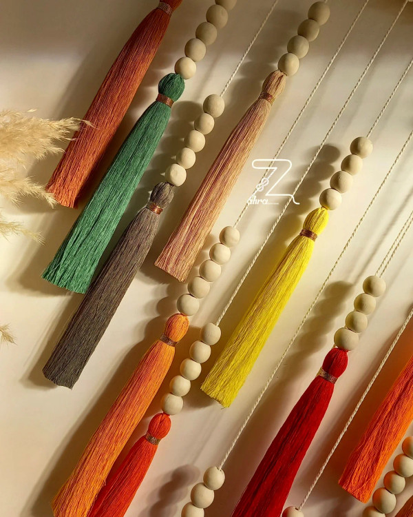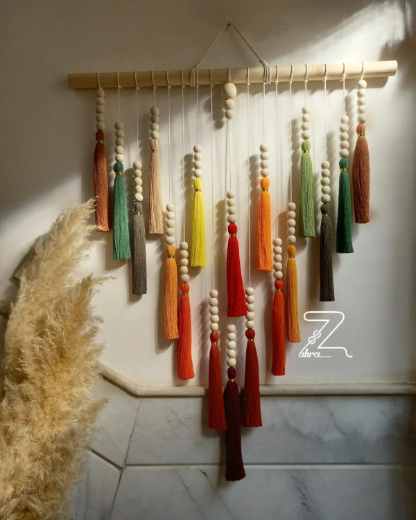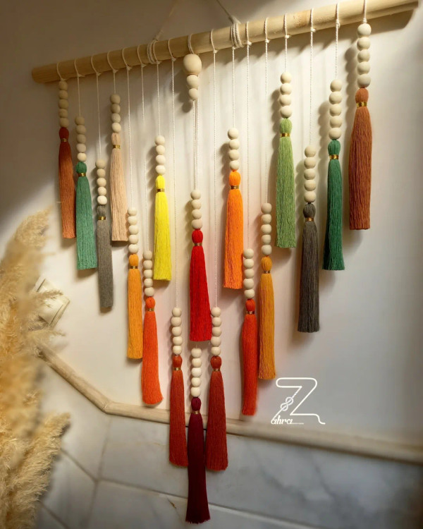 رنگین کمانی از جنس نخ و مهره . جزئیات ظریف و رنگهای زنده، این آویز با مهرههای چوبی و منگوله های رنگارنگش یه هماهنگی و ترکیب بینظیری شد اگه دنبال دکوراسیون خاص و متفاوت هستی پیشنهادم ایشونه . ابعاد و طیف رنگی سفارشی انجام میشه .