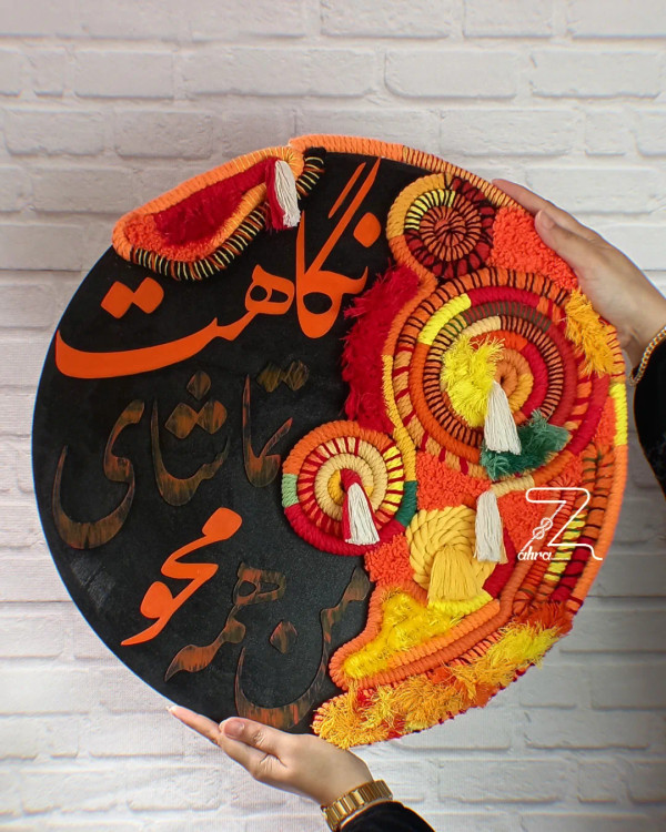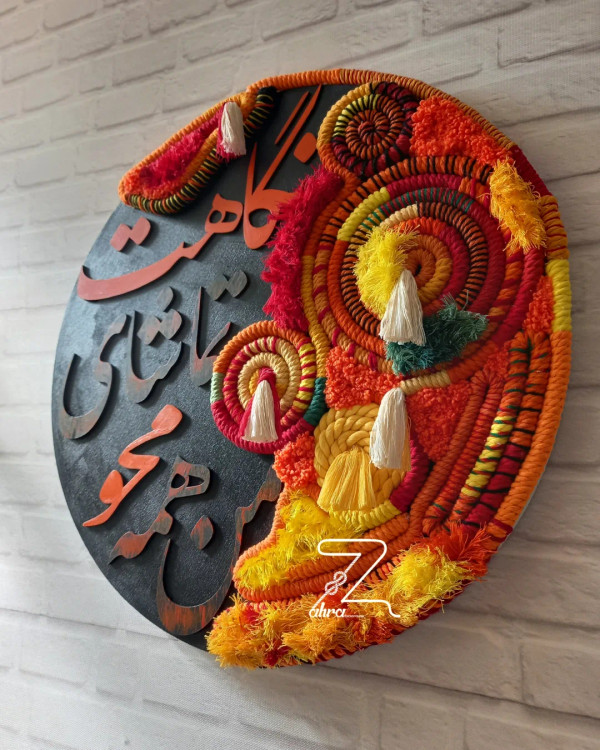 " من همه محو تماشای نگاهت بالاخره با افتخار تابلویی رو رونمایی میکنم که حاصل تلفیق دو هنر اصیل و دیرینه ی ، مکرومهبافی و کالیگرافیه! تابلویی که با عشق درستش کردم این ابتکار برای اولین بار تو دنیا هست که به اجرا دراومده و با جسارت ، عشق و ظرافت، تار و پود هر دو هنر رو با هم پیوند دادم تا داستانی نو رو روایت کنم. این تابلو نه تنها یک اثر هنریه، بلکه نمادی از نوآوری وخلاقیتِ با نگاه به این اثر، دعوت میشید تا در دنیایی از رنگها، بافتها و خطوط غوطهور شید این کار با یه مصرع زیبا از شعر فریدون مشیری جان (چون من عاشق شعرشم!) مزین شده، و قراره شروعی باشه برای یه مجموعه جذاب دیگه. امیدوارم این اثر هنری بتونه قلبهاتون رو لمس کنه منتظر نظرات ارزشمندتون هستم! . اسم اثر : من همه محو تماشای نگاهت قطر کار 50 سانت . "